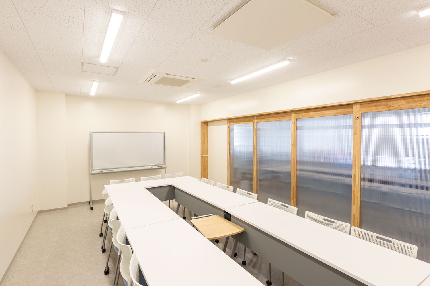 18名まで打ち合わせ可能な会議室で、イベント時の控え室にもご利用いただけます。椅子(18脚)、机(180cm)、ホワイトボードはご利用料金の中に含まれます。