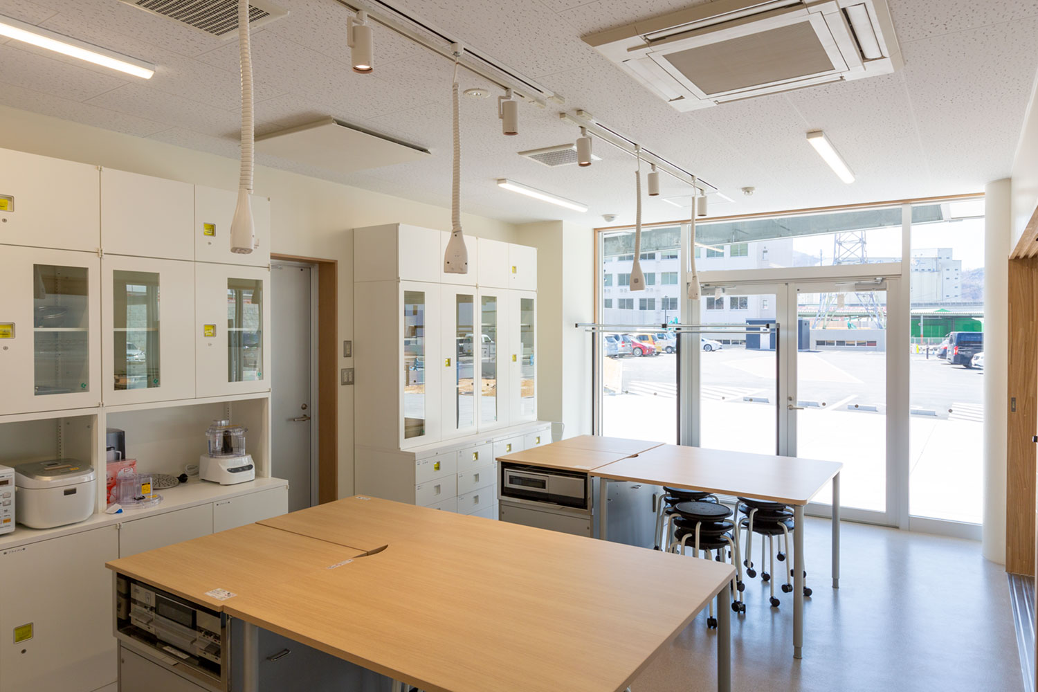 コンロ2台(ガス、IH)と流し台があり、炊飯器、オーブンレンジ、フードプロセッサー等の調理器具、食器類がご利用いただけます。